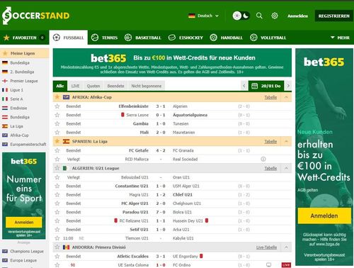 Además de todo tipo de estadísticas sobre equipos y jugadores, reseñas y avances. Como un servicio especial, Soccerstand ofrece enlaces a casas de apuestas populares y muestra si es posible apostar en vivo para un partido. Y si el juego se puede transmitir legalmente, también se mostrará un enlace a las respectivas transmisiones en vivo. Una oferta superior. Los fanáticos del fútbol en particular obtienen todo lo que necesitan aquí. Especialmente partituras en vivo sin fin. Además de King Soccer en sus principales ligas de fútbol, Soccerstand también ofrece muchos otros deportes y competiciones. Tenis, baloncesto, hockey sobre hielo, balonmano y muchos más.
